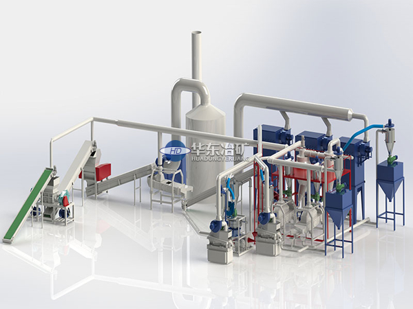 報(bào)廢鋰電池由輸送機(jī)送入一級(jí)撕碎機(jī)中進(jìn)行撕碎,撕碎后的物料通過(guò)輸送機(jī)送入二級(jí)多刀破碎機(jī)中進(jìn)行第二次破碎,二次破碎后的物料進(jìn)入到輸送機(jī)中同時(shí)設(shè)置磁選設(shè)備,可以將物料中的鐵分選出來(lái)。分選后的物料經(jīng)輸送機(jī)送入氣流分選機(jī),通過(guò)引風(fēng)機(jī)和旋風(fēng)下料器把正負(fù)極中的隔膜紙分離出來(lái),把分選后的正負(fù)極片進(jìn)入到三級(jí)粉碎機(jī)中進(jìn)行細(xì)碎,將物料粉碎到20目左右。粉碎后的物料由負(fù)壓系統(tǒng)進(jìn)入到旋風(fēng)分離器中進(jìn)行粉塵過(guò)濾,并通過(guò)兩次氣流分選,使不同密度的物質(zhì)進(jìn)行分層,然后得到正負(fù)極材料與銅、鋁、鎳等材料,而所有的超細(xì)粉塵由負(fù)壓系統(tǒng)帶入脈沖除塵器中進(jìn)行收集。而過(guò)濾得到的尾氣將繼續(xù)由負(fù)壓系統(tǒng)送入到尾氣處理設(shè)備中進(jìn)行空氣凈化,使之達(dá)到國(guó)家排放標(biāo)準(zhǔn)后再進(jìn)行高空排放。