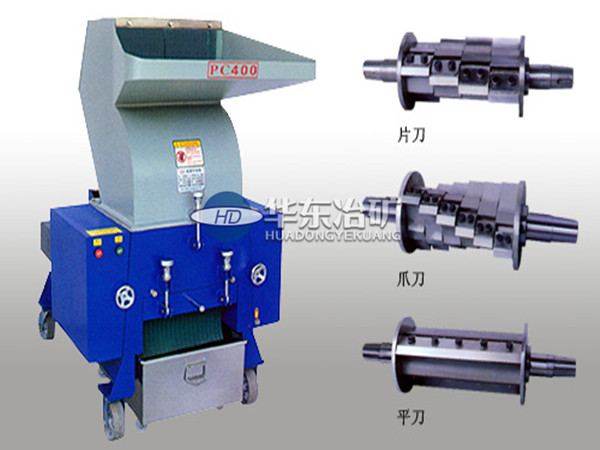 本機由電機傳動至減速機,帶動主軸轉動,使相對固定刀往內轉動,從而將由上入料的原料瞬間切割、擠壓、撕扯至限定尺寸后,下落至出料倉,從而達到破碎的目的。