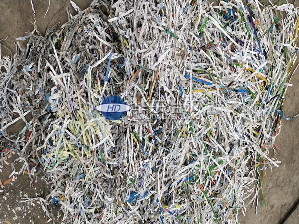 廢紙放入進料皮帶后,自行前進到預碎刀盤,進行高間距上下雙排切割至20%進度后,被送至二排中間距刀盤切割至15%進度,送至第三排中低速轉(zhuǎn)動的M型短刀輥進行篩網(wǎng)和刀輥的切割、切片破碎至達到篩網(wǎng)出料尺寸后完成出料,本機屬于中低速破碎方式,無噪音、無粉塵。