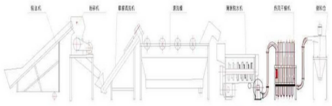由輸送機(jī)將原料送至破碎,預(yù)碎機(jī)已速比1:35的超低轉(zhuǎn)速,用雙刀盤將塑料撕裂,切碎至3-10CM片狀,然后將片狀原料送至,二次粉碎機(jī),通過(guò)合金刀盤的高速轉(zhuǎn)動(dòng)將其破碎,粉碎機(jī)底部有出料篩網(wǎng),可根據(jù)需要控制出料尺寸,出料后,由水力清洗機(jī)對(duì)塑料進(jìn)行清理,再由脫水機(jī)進(jìn)行脫水作業(yè),脫水后的塑料顆?梢灾苯铀椭,氣流烘干送至料倉(cāng),作為再生塑料備料儲(chǔ)存。